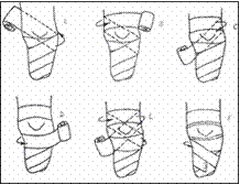 Lleve la venda por delante del cuerpo hacia el muñón, dando una vuelta alrededor de éste y luego otra vez alrededor del cuerpo .