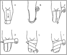 Para la aplicación del vendaje se necesita un número variable de vendas de distintos anchos según el grueso y largo del muñón las que deberán coserse por la punta.
