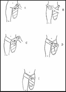 Comience a hacer el cinturón a partir de la parte interna de la ingle y lleve la venda hacia afuera siguiendo el pliegue de la ingle.