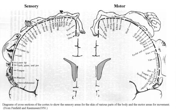 En los años 40, el Dr. Penfield tuvo la idea de aprovechar las operaciones cerebrales que se efectúan sin anestesia, ya que el cerebro no es sensible al dolor, para ir estimulando con un hisopo diversos puntos de la corteza cerebral. A medida que hacía esto interrogaba al paciente sobre sus sensaciones y con esta información consiguió elaborar un mapa que llamó homúnculo somatosensorial y lo imaginó como una figura humana desproporcionada de enormes cara, manos y pies, en relación al tamaño de las zonas de la corteza encargadas de cada parte del cuerpo.