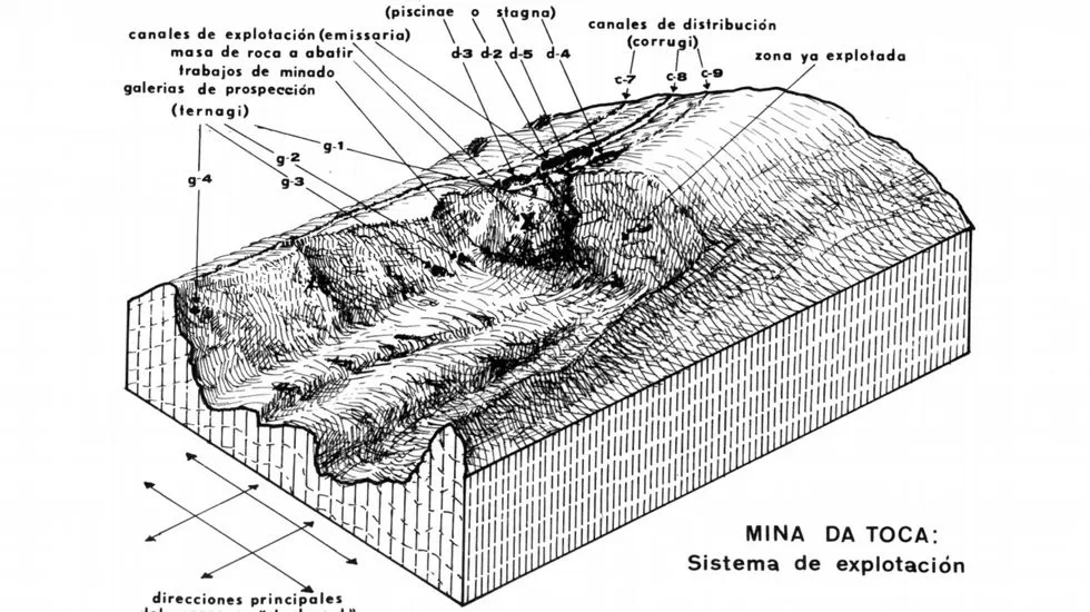 En ambos os tipos de xacementos, os sistemas de explotación incluían o picado a man, a erosión superficial do xacemento mediante canles perpendiculares ás pendentes e o derrubamento de materiais por fórzaa da auga ou ruína montium.